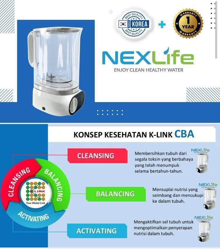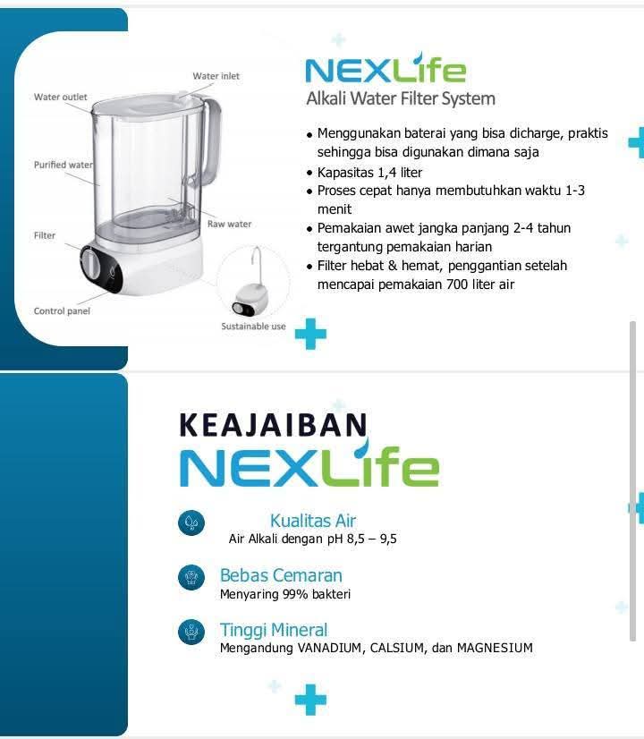 Nexlife adalah alat filtrasi air yang dapat memurnikan air minum menjadi air alkali (bersifat basa) yang penuh dengan mineral baik seperti Vanadium, Kalsium, Zinc, dan Tembaga.