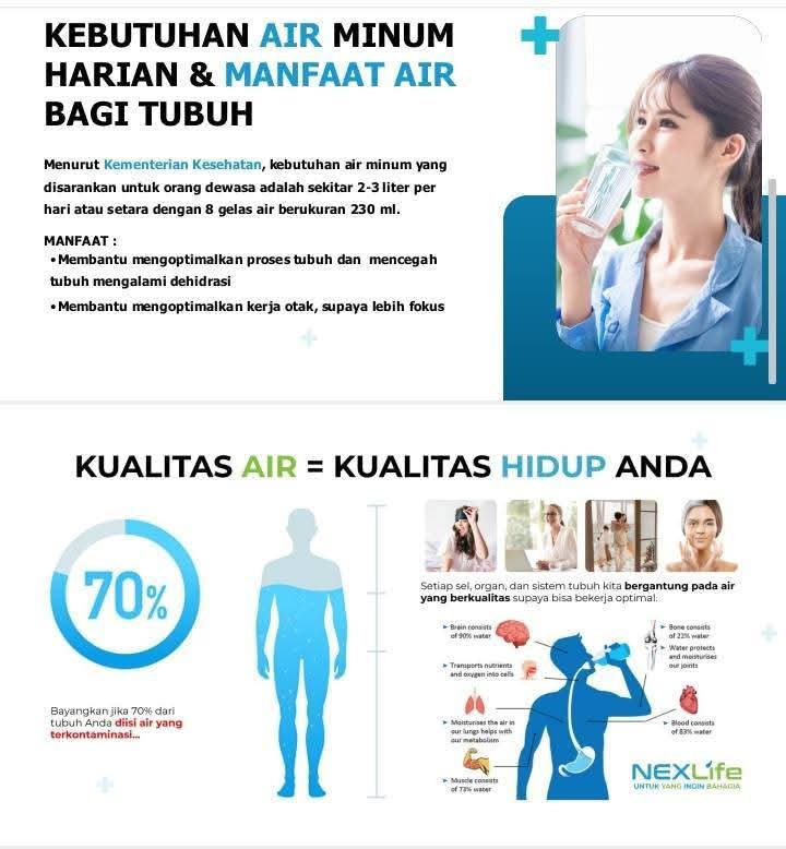 Hemat : Mari kita hitung. Jika dihitung, biaya per liter air NexLife jauh lebih murah daripada membeli air alkali atau air mineral botolan setiap hari. Anda menghemat uang, mengurangi sampah plastik, dan yang terpenting, Anda berinvestasi untuk aset paling berharga: kesehatan keluarga Anda. Bayangkan memiliki sumber air sehat premium tanpa batas, langsung di rumah Anda, dengan biaya yang sangat efisien.