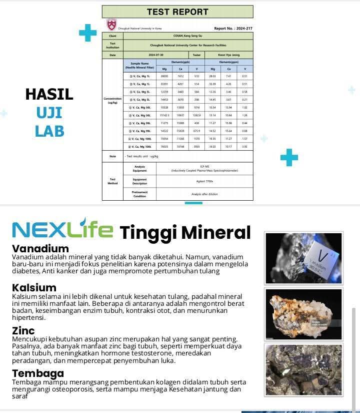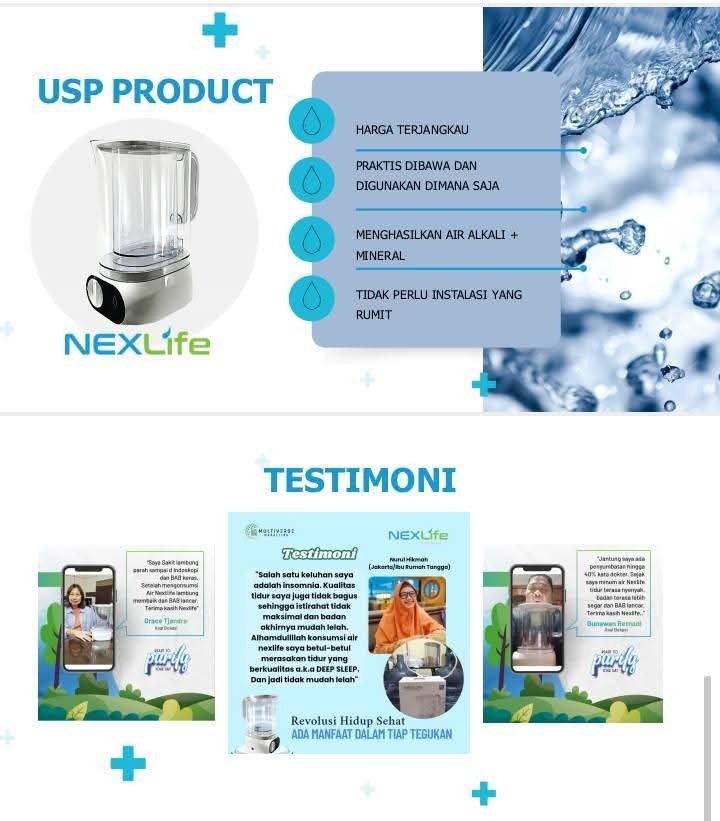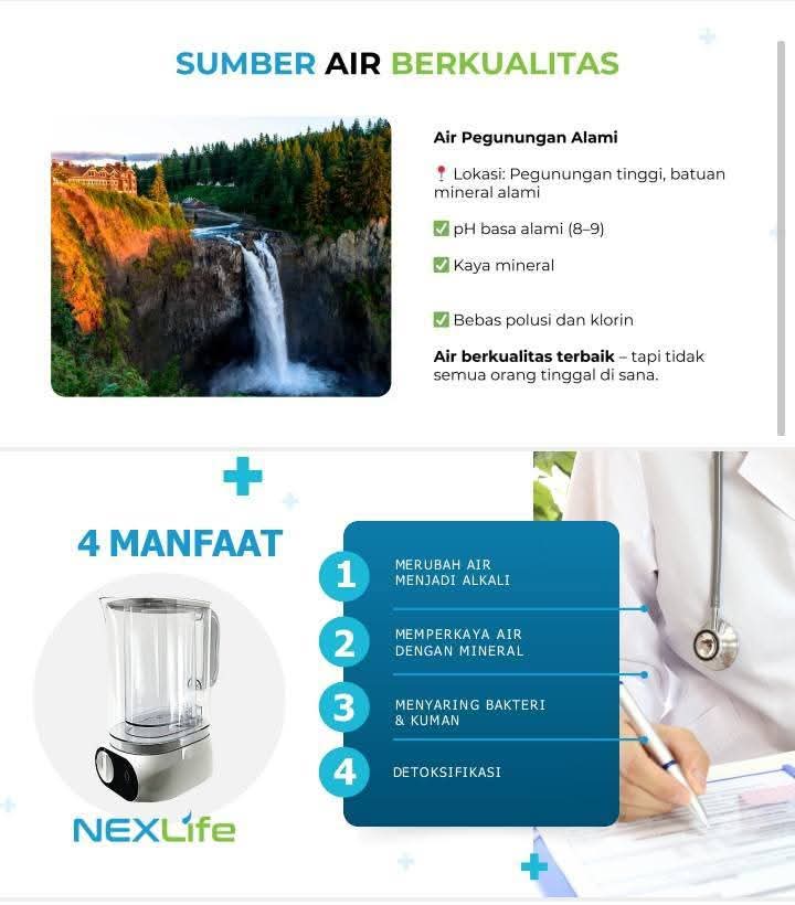 Air NexLife : Tidak hanya memurnikan, tetapi secara cerdas menambahkan kembali mineral-mineral esensial yang dibutuhkan tubuh Anda, sambil menaikkan level pH-nya menjadi alkali kualitas unggul.